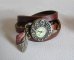 Montre au cadran vintage bronze original, avec effet asymétrique, bracelet en cuir véritable marron 3 tours de poignet avec une belle pierre naturelle de forme losange et une breloque Plume.