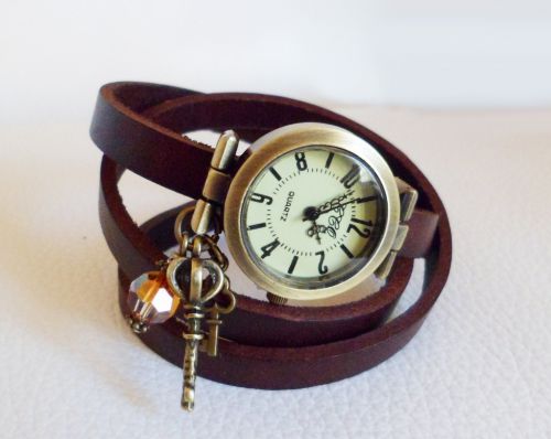 Montre bracelet en cuir style vintage décorée de breloques clés et d'une belle perle en cristal Swarovski cuivrée...