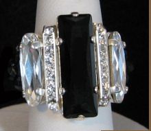 Cette bague aux composants Swarovski, de la série Balleny, est composée autour d'un grand cabochon Princess de couleur Noir (Jet) et de belle taille ( un rectangle de 21 mm de haut par 7 de large). De chaque côté, des barres argentées aux strass Crystal Swarovski encadrés de cabochons marquises dans un coloris Crystal en contraste.