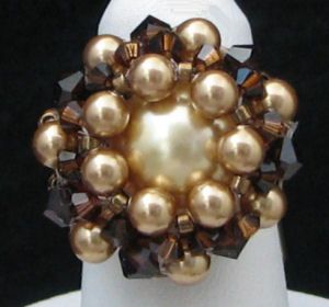 Une grosse perle nacrée en cristal Swarovski d'un doré trés clair est sertie par un ensemble de perles rondes nacrées d'un doré lumineux en constraste avec un duo de toupies Marron et Mocca foncé, toutes en cristal Swarovski. Facettes et Delicas dorées pour le dos et l'anneau de la bague.