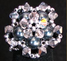Une bague ronde qui reprend les couleurs du bracelet Comores Noir et argent, montée avec des perles nacrées Swarovski gris/noir tahitien et des toupies en cristal Swarovski argentées et cristal, et des facettes en cristal tchèques noires et argentées.