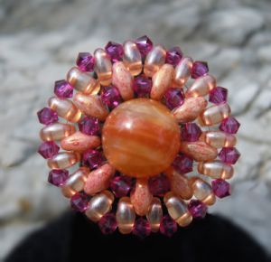 Une bague aux couleurs chaudes : comme un double pétale fait de perles Twin beads aspect nacrée et céramique rosé et de toupies Swarovski fuchsia avec au coeur une perle naturelles d'un orange ambré en pierre Red Sardonyx (famille des agates). Un anneau en Twin beads et rocailles bronze doré pour cette bague originale comme posée sur le doigt.