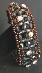 Un bracelet en tissage de facettes de couleur Gris moyen, sur lequelles sont montés des strass coloris Crystal et une dentelle de rocailles fines bronze. Fermoir mousqueton bronze cuivré. Facettes et strass en cristal tchèque.