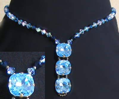 Harmonie de tons autour de la couleur bleu aquamarine des cabochons en cristal Swarovski, avec des toupies (dont la belle couleur Bleu marine métallique) et, pour la partie le long du coudes petites facettes aquamarines et cristal AB, douces au contact. Monté sur fil cablé avec fermoir mousqueton plaqué argent, rocailles argenté clair).